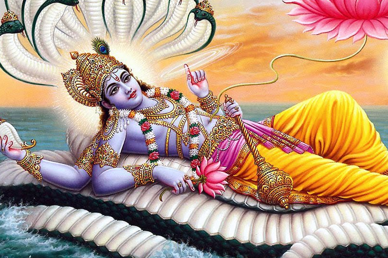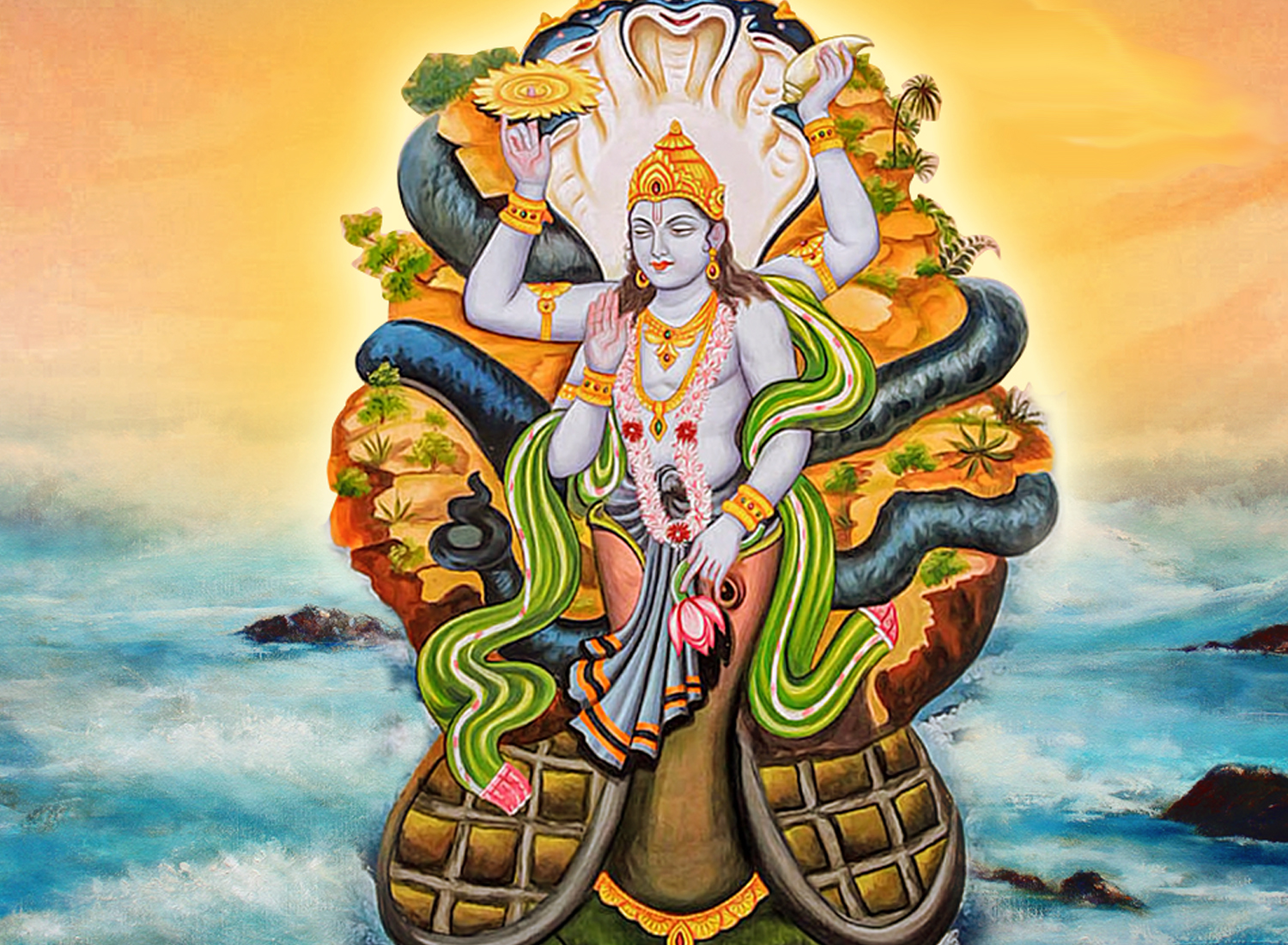 In this incarnation, the Lord Vishnu manifested as a tortoise. The sage out of respect presented a garland of flowers to Indra who carelessly ignored his humbleness. Indra's elephant trampeled the garland, hence the sage in rage cursed Indra to loose all his wealth in to ocean.