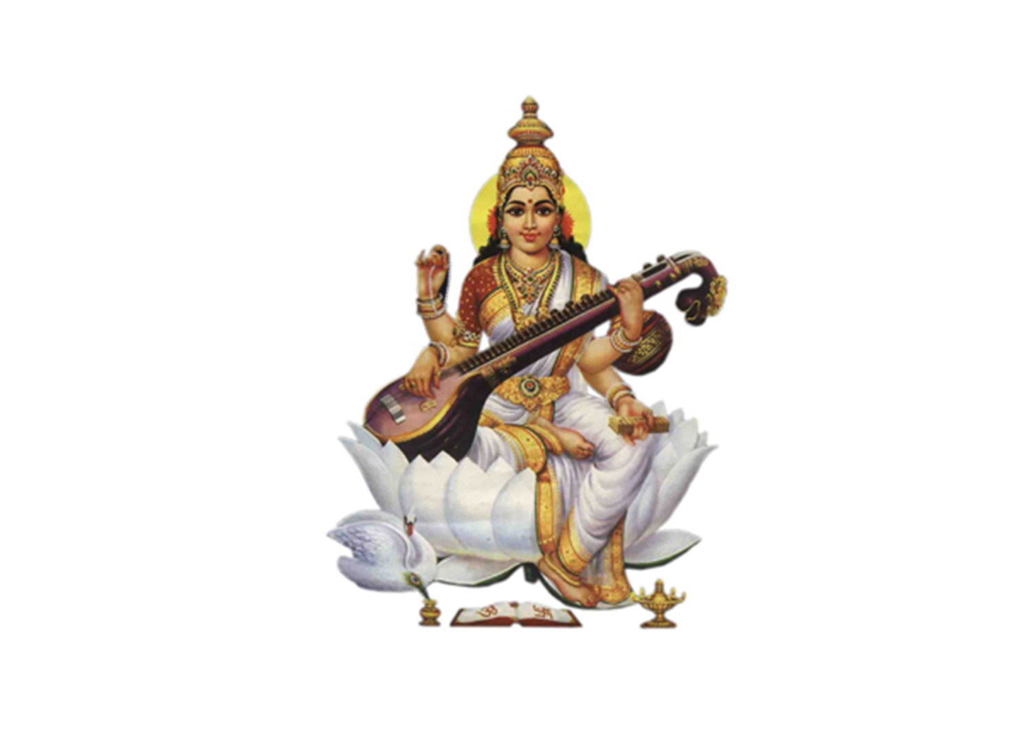 Mother Saraswati is dressed in white garments which gives us the impression of pureness. A teacher is considered a devotee of Saraswati Maa and therefore he/she should be pure in his mind, words and actions. Maa holds a book on her left hand, meaning knowledge and a rosary (mala) on her right hand which denotes bhakti. A teacher should be pure so that his/her students learn accordingly.
