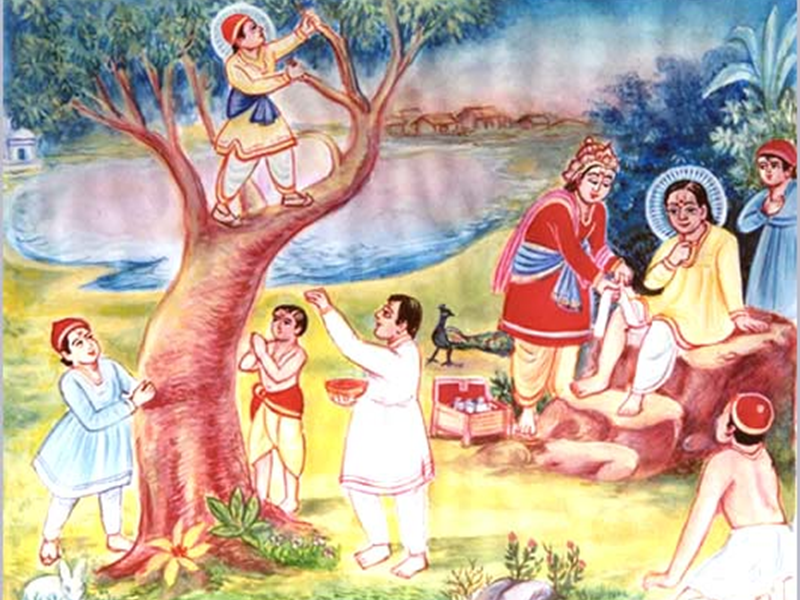 Once after listening to the Ramayan, Ghanshyam said to his friends, “Come on, let us go to the pond to bathe.” Everyone bathed for a long time. Then they began to play on the trees on the pond bank. Ghanshyam climbed up a tamarind tree. While in the enthusiasm of playing, he was climbing down the tree, a piece of stubble of the tamarind tree cut his right thigh and he bled profusely. Doctors bandaged him. The bleeding stopped. The wound was healed. But the print of the wound remained there permanantly.