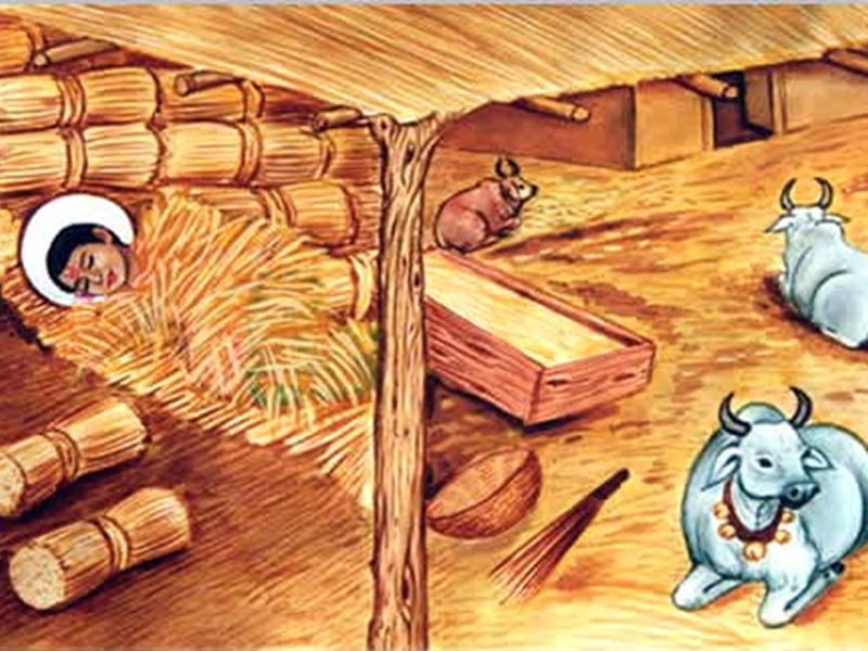 Ghanshyam was offended. He ran down to the house, secretly hid himself in the heap of hay in the manger so that no one could find him. When the elder brother returned home in the afternoon, Bhaktimata, seeing him all alone, inquired about Ghanshyam. He replied, “ Ghanshyam has already come home.” “No, he hasn’t come yet,” said the mother. The elder brother was now surprised. He said, “He on being offended must have run away somewhere when I tried to beat him. “